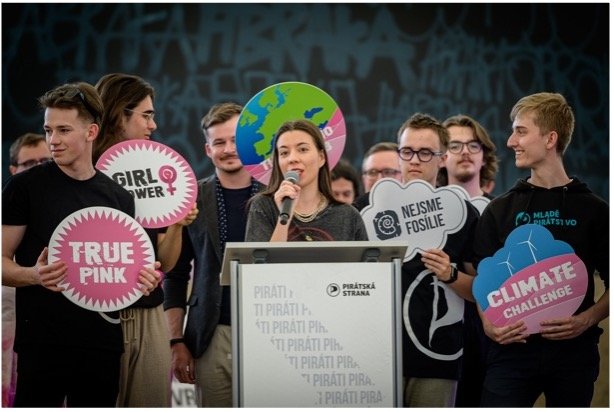 Hlavním bodem celé akce byla samozřejmě tisková konference. K mikrofonu se postupně dostali různí pirátští představitelé, včetně čelního eurokandidátstva a pirátských ministrů. A nesměly chybět ani zástupkyně Mladého Pirátstva. Na pódiu zazářily poslankyně Klára Kocmanová a předsedkyně Mladého Pirátstva Kateřina Stojanová.